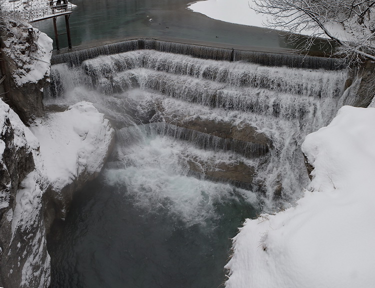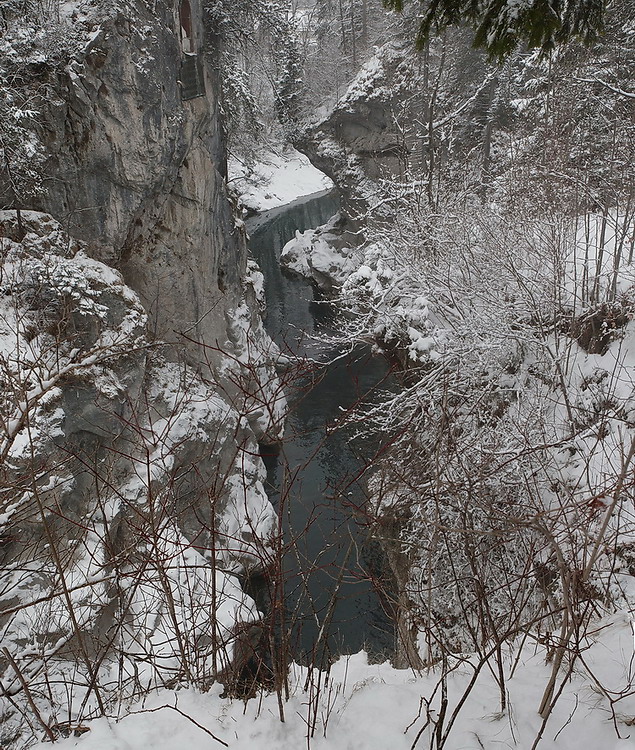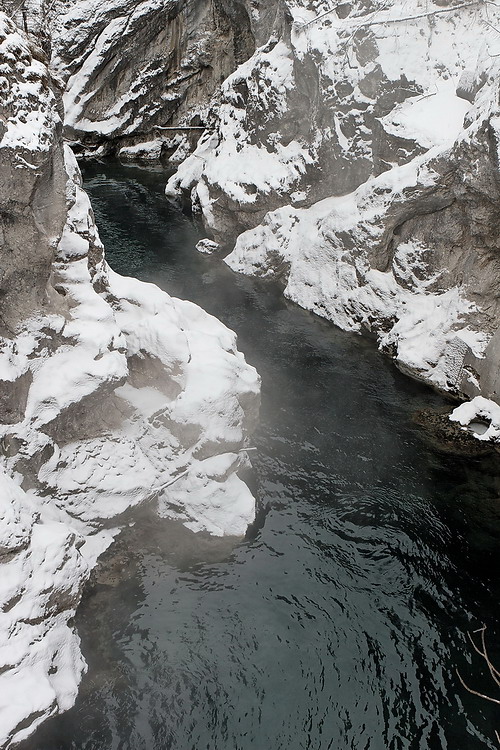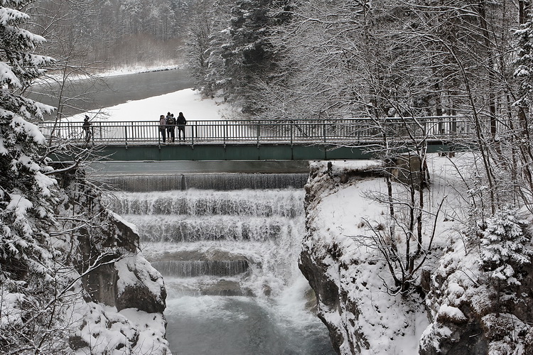 Fuessen, the highest town in Bavaria (808 m) is lying at the end of the Tyrolian Lech valley and worth a visit even in suboptimal weather conditions. Being a settlement on the Via Claudia Augusta the town was founded already in Roman times. Apart from the towns' landmarks like the picturesque old town, the Benedictine Monastery of St. Mang and the castle there is another point of interest: the Lech Fall. The Lech Canyon was formed about 12.000 years ago at the end of the last glacial maximum, when melting water of the Lech glacier forced its way into the former Lake Fuessen. Today the Lech is flowing across a retaining dam which was built already in 1787 to utilize the waterpower of the river.