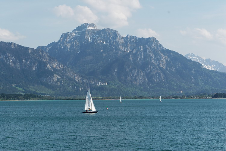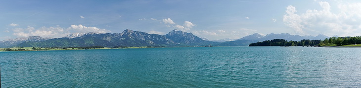 Forggensee, Bavarias fifth largest lake with a length of 12 km and a width of up to 3 km is another artificial lake with its dam erected in the years from 1950 to 1954. It is mainly used to generate electricity but also to regulate the floods of the river Lech. While Forggensee is partly drained in winter two motor vessels are crossing the lake during the summer season, stopping for example at the Musical Theatre Neuschwanstein, Rosshaupten and finally at the dam.