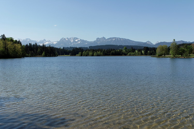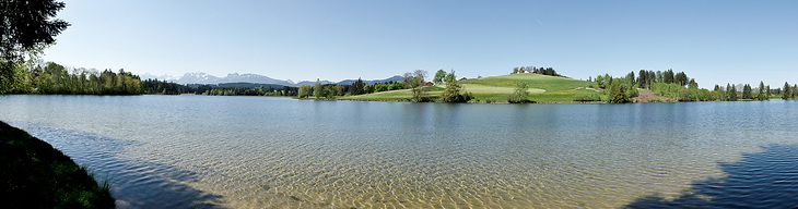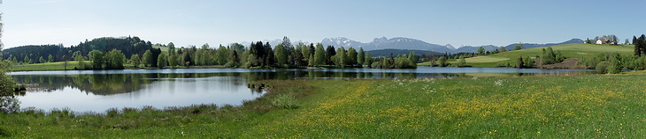 An artificial lake called Schwaltenweiher is located between Seeg and Rueckholz in the eastern part of the Allgaeu. It was already set up in 1514 by the emperor Maximilian I for fish farming and as hunting ground for water birds. Up to 4 m deep Schwaltenweiher belongs to the most popular swimming lakes in this area and is also called the 'loge in front of the alps' due to its nice mountain panorama.
