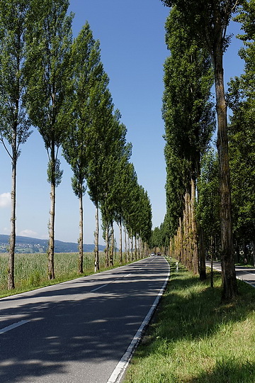 The dam connecting the island and the mainland is part of a moraine ridge which extends up to the Mettnau peninsula. It was built on the initiative of Napoleon III. The cottonwood alley which marks the southern end of the German Avenue Road is 1.3 km long and separated by a 30 feet ditch which is passable for small boats.