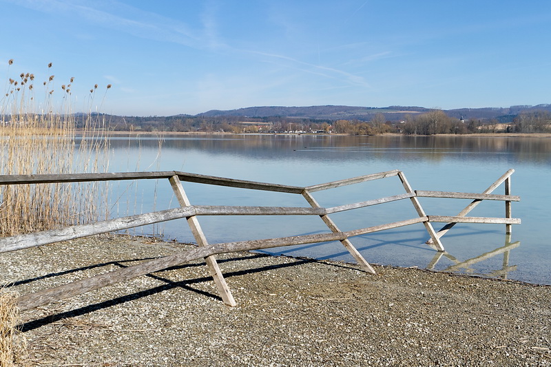 Wenn im Frühjahr die Schneeschmelze in den Alpen einsetzt, steigt auch der Wasserstand des Sees. Die großflächigen Riedwiesen stehen dann unter Wasser und können erst wieder im Winter gemäht werden. Um einer Ansiedlung von Gehölzen wie Kreuzdorn, Hartriegel und Weiden vorzubeugen, wird diese Pflegemahd jedes Jahr von Naturschützern durchgeführt.