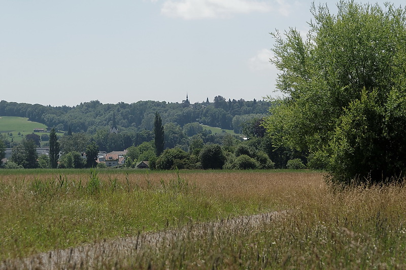 Auf der anderen Rheinseite erkennt man eine der bedeutendsten historistischen Schlossanlagen der Schweiz: das Schloß Castell mit der der aus dem 12. Jahrhundert stammenden Burg Castell. Ob man jedoch den Aussichtspunkt am Ende des Weges trockenen Fußes erreicht, hängt vom aktuellen Wasserstand des Rheins ab. Bei 4,65 m (Pegel Konstanz) sollte man schon Gummistiefel im Gepäck haben oder im Hochsommer wiederkommen.