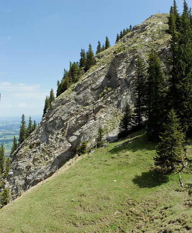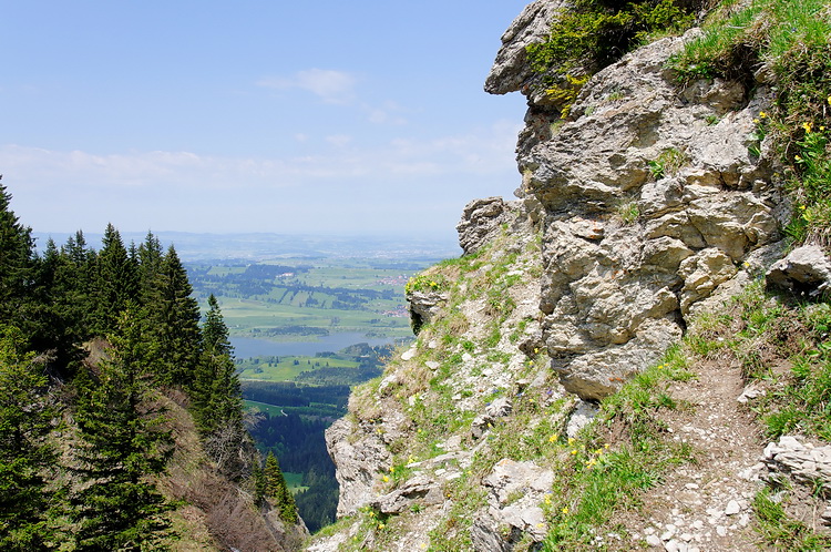 Ein kurzer Gegenanstieg führt zum Gipfel der Alpspitze, die nach Norden steil abbricht und deren Tiefblick in das Allgäuer Alpenvorland eine gute Ergänzung zum eher nach Süden ausgerichteten Edelsberg darstellt.