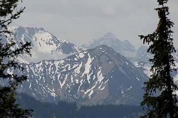 ... indem man dem Abstiegsweg in Richtung Westen folgt. Nach etwa 10 Minuten öffnet sich das Gelände und gibt den Blick frei auf die Allgäuer und Vorarlberger Gipfel im Süden.