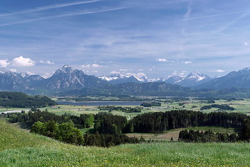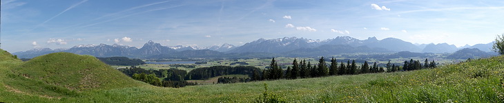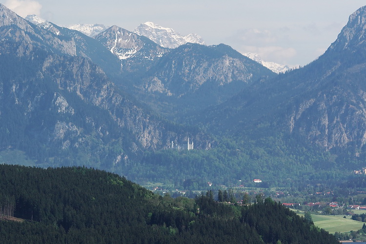 Apart from the peaks around Saeuling, Thaneller and Aggenstein one should mention the 'three-castles-view'. Neuschwanstein is located in the left part of the panorama just behind the ruins of Hopfen Castle (and also below Zugspitze and Schneefernerkopf). Hohenschwangau and Fuessen Castle are following to the right.