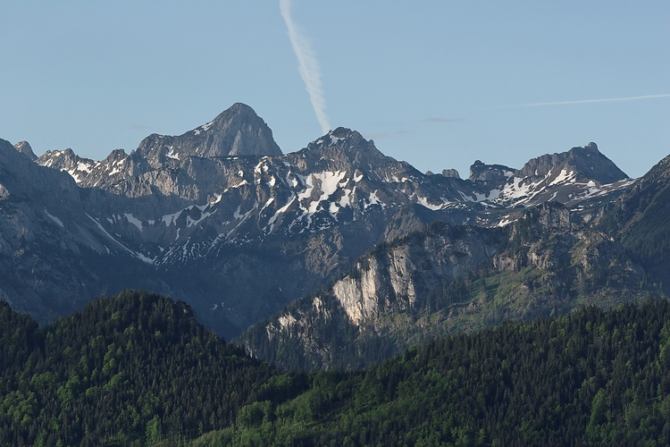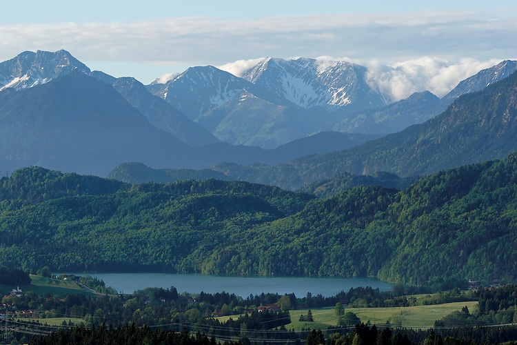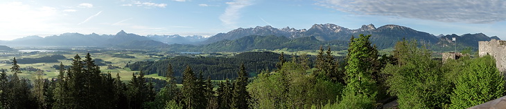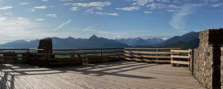Die Aussicht gehört mit zu den besten, die das Allgäu zu bieten hat: Hopfensee, Weißensee und dahinter die Allgäuer und Tiroler Berge bis hin zum Schneefernerkopf im Wetterstein (die Zugspitze wird allerdings durch den Säuling verdeckt).