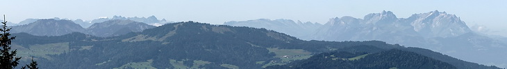 View of the Austrian Bregenzerwald area including summits like Winterstaude, Mittagsspitze and Dornbirner First from a place just below the summit of Kojenstein.