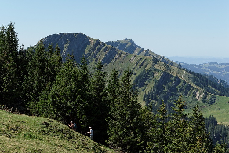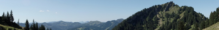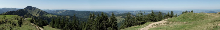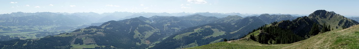 Der Ausstiegspunkt der Leiter und gleichzeitig der Gipfel des Steinebergs befindet sich ganz rechts im Panorama und wird von den meisten links liegen gelassen. Der Weg führt weiter zum Stuiben und Hochgrat, wobei wir an dieser Stelle gerade mal ein Fünftel des Weges zurückgelegt haben, von den Höhenmetern gar nicht zu sprechen.