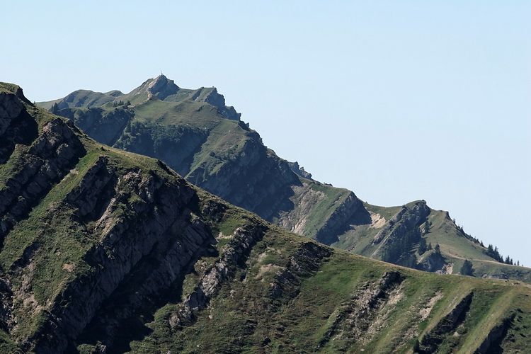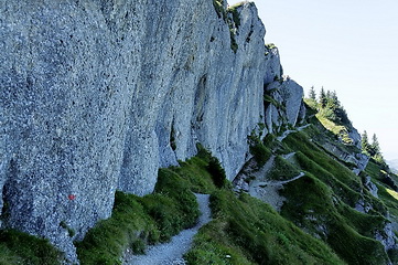 The summit can either be reached using the metal ladder or much easier the path below an imposing 'Nagelfluh' wall.