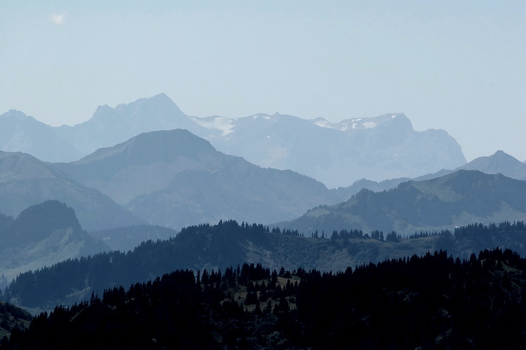 The panorama on Steineberg is remarkable: the Bavarian mountains in eastern direction, Sceasplana the highest peak in the Austrian Montafon area (left picture) up to Tödi in Switzerland.