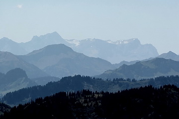 Die Rundsicht auf dem Steineberg ist bemerkenswert: von den Bayerischen Alpen im Osten über die Gipfel des Montafons (Scesaplana - linkes Bild) bis zum Tödi in den Ostschweizer Alpen (rechts - im Hintergrund).