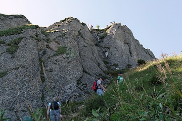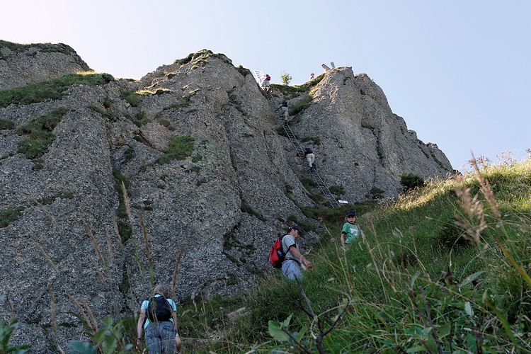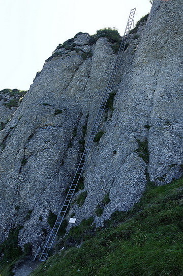 Den Gipfel erreicht man entweder über eine Metallleiter oder, wesentlich stressfreier auf dem 'Normalweg' unter einer imposanten Nagelfluh Felswand hindurch.