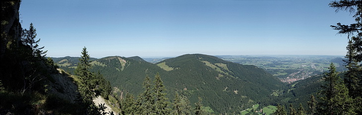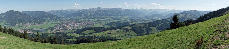 Ein sehenswertes Panorama vom Grünten bis zum Widderstein erwartet uns bereits am Beginn der Wanderung.
