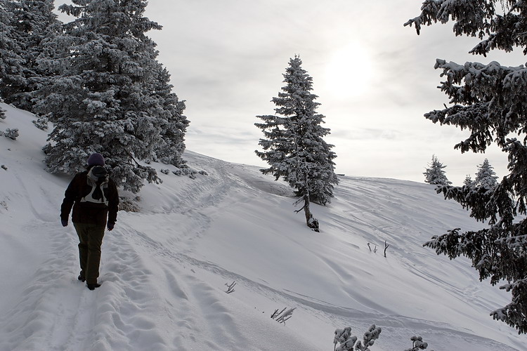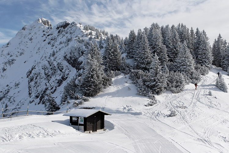 Auch wer ohne Ski unterwegs ist, kann hier die Wintersonne geniessen. Von einer Besteigung des Brandnerschrofen ist bei diesen Verhältnissen zwar abzuraten, es lohnt sich jedoch, dem meist gespurten Anstiegsweg bis zu einem Aussichtspunkt auf etwa der halben Strecke zu folgen.