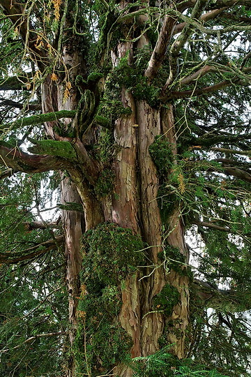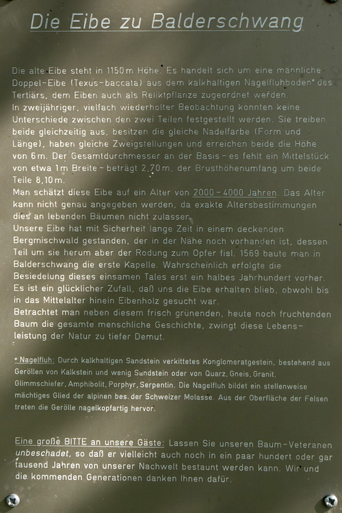 Etwa einen Kilometer nach dem Ortsende von Balderschwang in Richtung Riedbergpass folgen wir der Bergstrasse Richtung Norden und passieren dabei eine beeindruckende (mindestens) 2000 jährige Eibe.