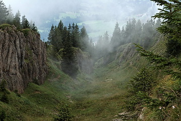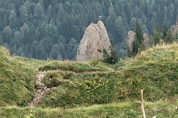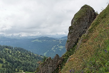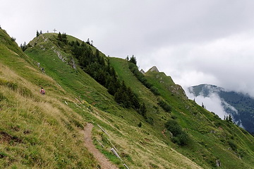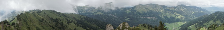 The summit was reached soon without difficulties. Unfortunately the Nagelfluh Ridge was partly covered by clouds. At least we could spot the cross on the upper part of an interesting climbing rock called Siplinger Needle (alpine grade IV - in the center of the panorama).
