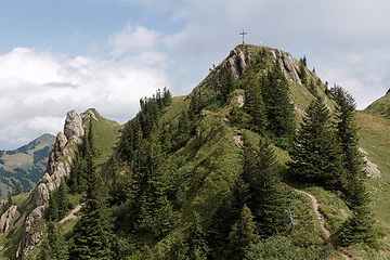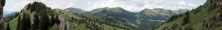 Der Gipfel ist bald erreicht und bietet keine besonderen Schwierigkeiten. Leider war der Blick auf die Nagelfluhkette etwas eingeschränkt, gut zu erkennen ist jedoch das Kreuz und der oberste Teil der Siplinger Nadel (Kletterei Grad IV - in der Bildmitte des Panoramas) .