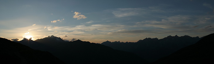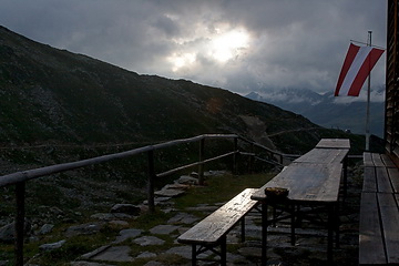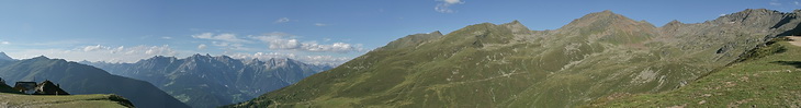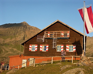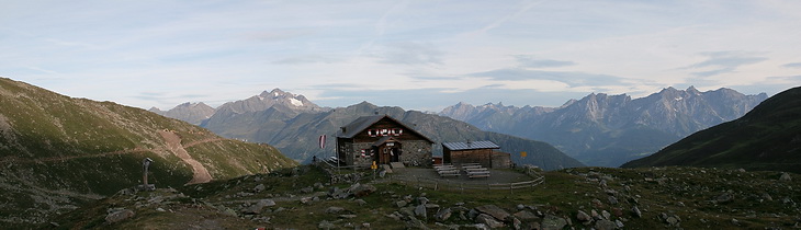 A short way below the hut (in the right part of the panorama, framed by Rotpleiskopf, Kübelgrubenscharte and Glockspitze).