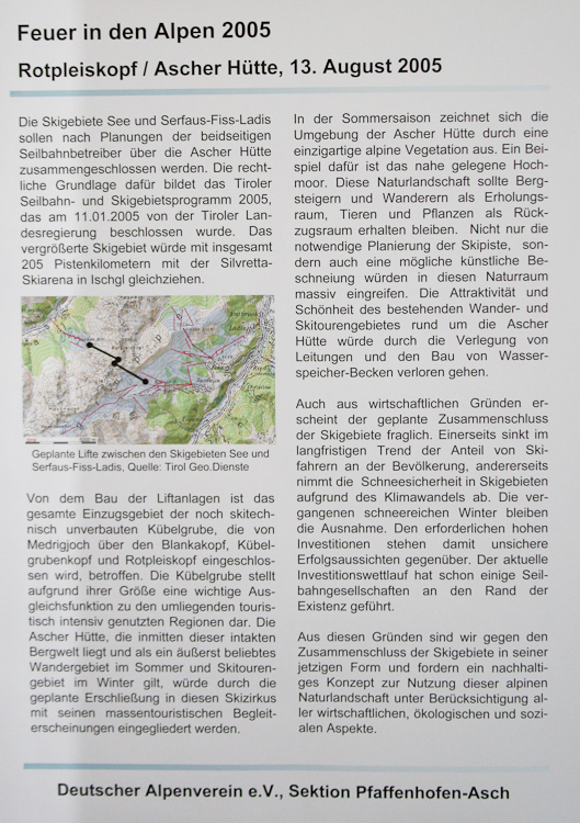 What only seemed to be quite nice had got a serious background based on a rather old tradition which was resumed in the middle of the eighties. Fires on summits have always been used as signs of warning and so they are used today to set a visible signal against the destruction of the alpine ecological system and for the preservation of the natural and cultural heritage of the alps. The topic in this special case was the joining of the ski areas of See and Serfaus which are in strong competition to the larger ski areas nearby.