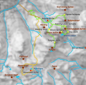 Das Paznauntal ist ein idealer Ausgangspunkt für verschiedene Berggruppen. Samnaun, Ferwall und Silvretta sind leicht zu erreichen und Tagestouren aus dem Tal sind genauso möglich wie mehrtägige Rundtouren. Ein zentraler Stützpunkt hierfür ist die Ascher Hütte, die man am besten von der Ortschaft See aus (1056 m) erreicht. Die Medrig-Joch-Bahn führt hinauf auf etwa 1800 m und von hier aus ist die Hütte bequem in 1,5 Stunden zu erreichen.