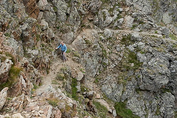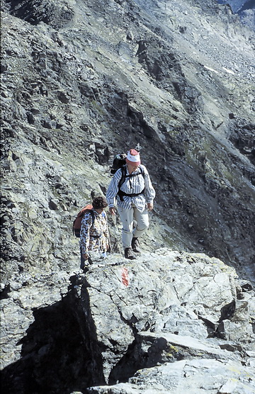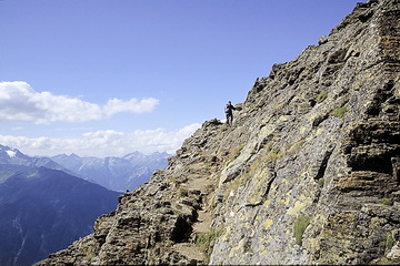 A marked path leads in eastern direction and after joining 'Koblenzer Weg' leads to the 'Medrigsattel' gap (2555 m). Some hundred meters behind the Medrig Saddle the path narrows and is belayed by cables. Caution is needed in this part of the ascent.