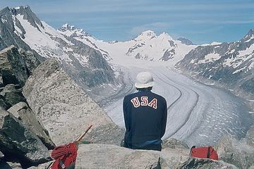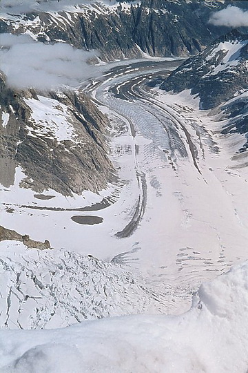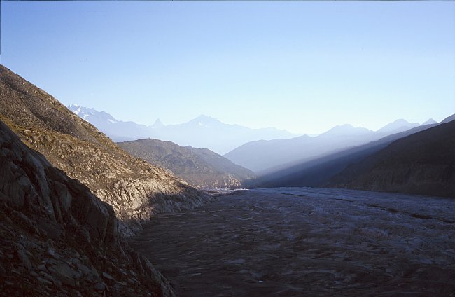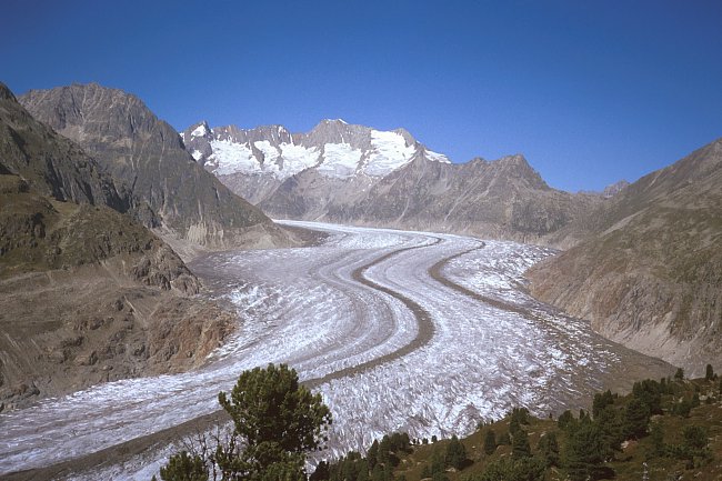 The Aletsch Glacier seen from the Riederalp with Wannenhörner in the background. The glacier is entered just below the lowest gap in the right part of the picture. |