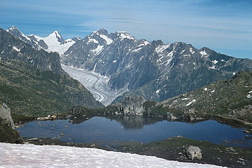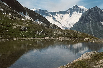 Lake on the Alp Märjela north of the Eggishorn. View to the east towards the Fiescher Glacier which is traversed on the way back to the starting point. Another Lake is situated on the Märjelenalp just before we entered the Aletsch Glacier. The well known glacier lake didn't exist in 1980.