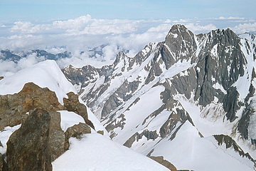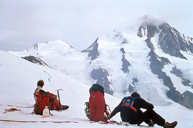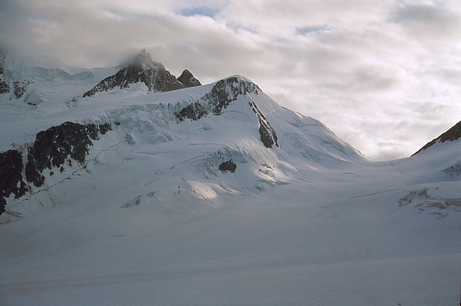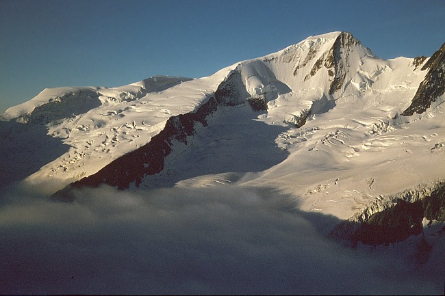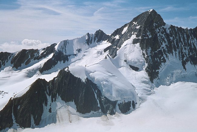 Grünhornlücke Blick nach Osten zum Finsteraarhorn (4274 m). Links das Agassizhorn (3953 m), in Wolken der Hugisattel (4088 m) gefolgt vom Nordwestgrat über den der Normalanstieg zum Finsteraarhorn führt.