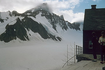View from the Finsteraarhorn Hut across the Fiescher Glacier in north-western direction to Grünegghorn (3860 m), Grossgrünhorn (4044 m) and Kleingrünhorn (3913 m). |