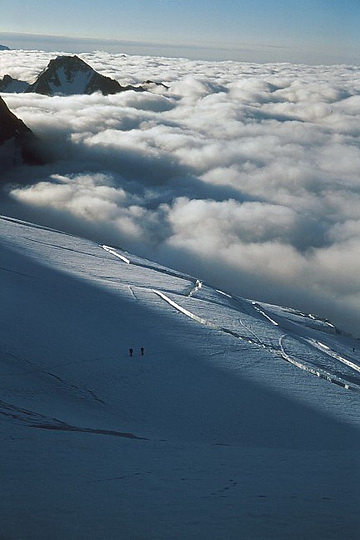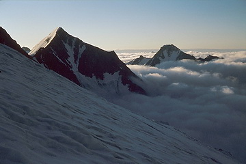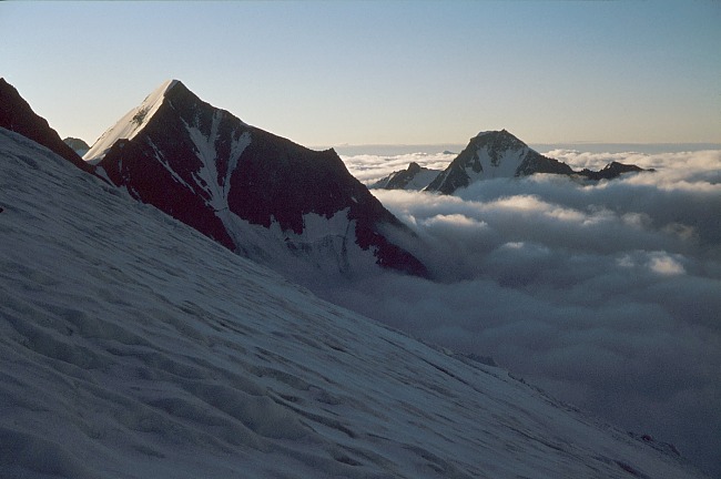 View to the east to Finsteraarhorn (4274 m), left the Agassizhorn (3953 m). In the clouds the Hugi saddle (4088 m) continued by the north-west ridge which is the standard ascent route. |