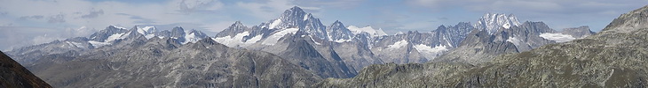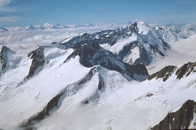 In the foreground - to the right - the Grünhorn Pass. Beyond the Rhone valley Matterhorn, Weisshorn, Dent Blanche and Grand Combin. Just above the Aletschhorn the Mont Blanc. |