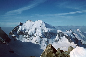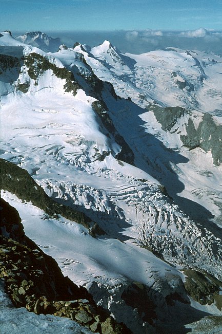 Blick vom Nordgipfel auf Crast Alva, Piz Bernina, Piz Scerscen und Bellavista. Der Übergang vom Nordgipfel zum Hauptgipfel rechts, an diesem Tag nicht mehr zu bewältigen. Alle drei Seilschaften verzichten auf den gefährlichen Weg. Links hinten Piz Zupo und Piz Argient.
