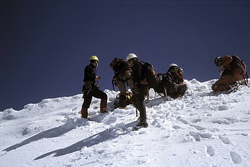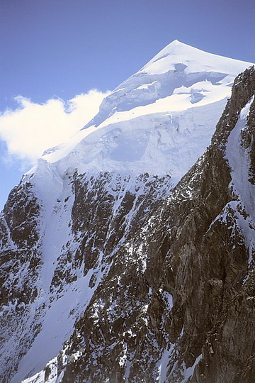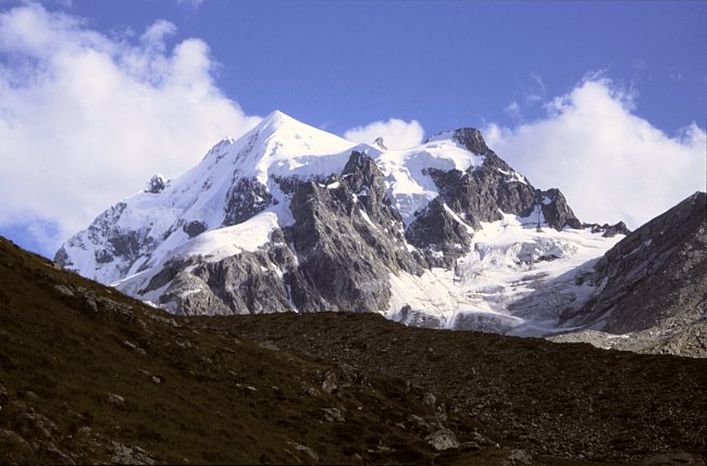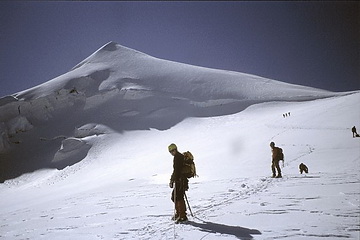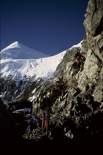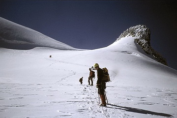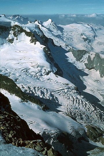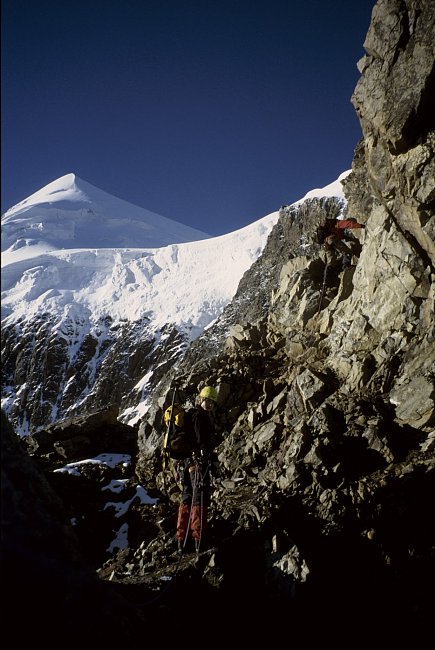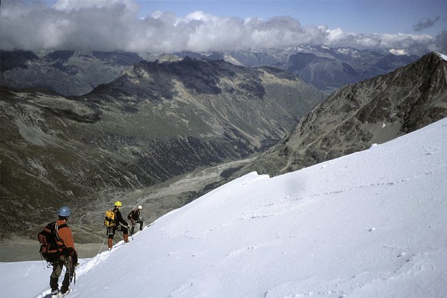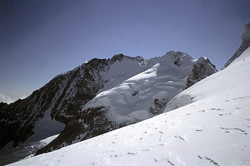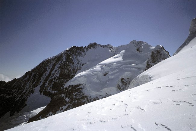 Just before point 3733 m (right) we joined the climbers of the normal ascent route from the Coaz Hut. Steep snow slopes lead to the north summit.