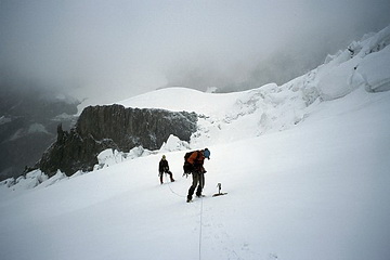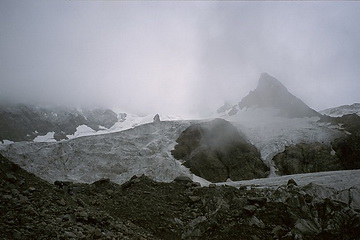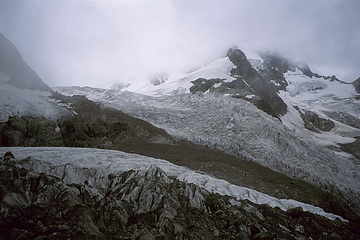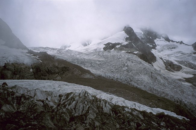 First view of the 'Eselsgrat' ridge and the north summit of Piz Roseg. Our first attempt to reach the Eselsgrat got stuck in the mist.