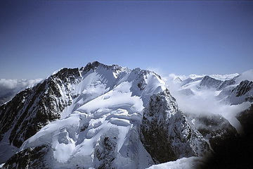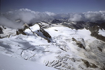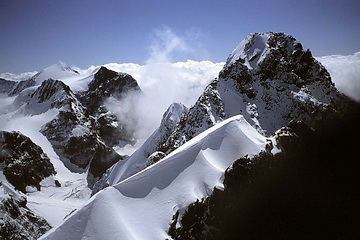 Crast Alva and Bianco-Ridge, Piz Bernina and Piz Scerscen seen from a height of about 3800 m and finally the north summit of Piz Roseg.