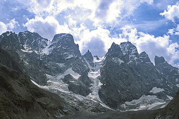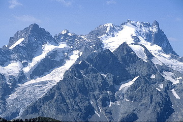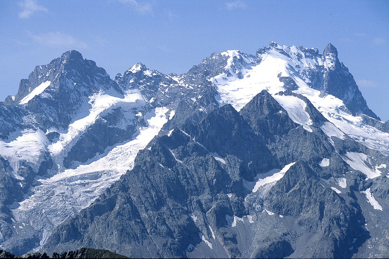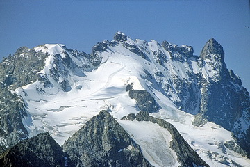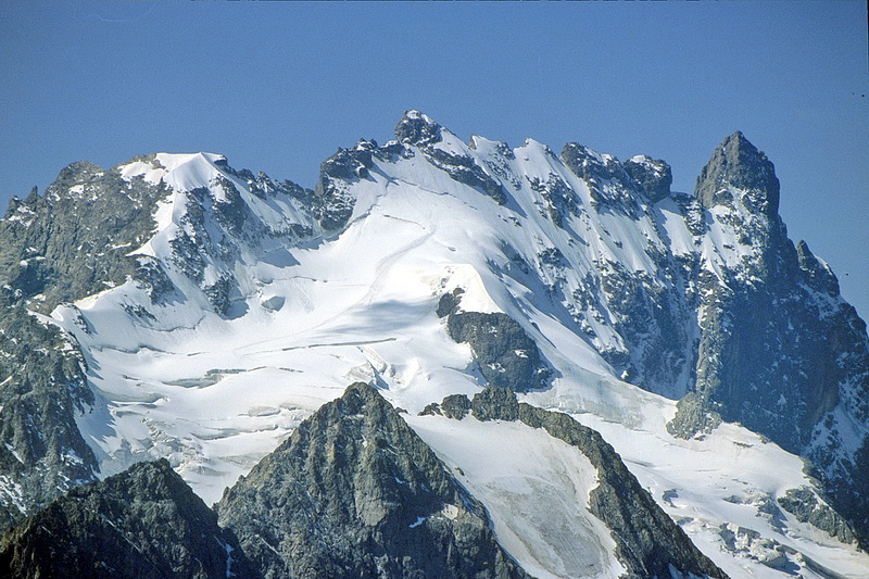 Detailed view of the Meije with Pic Oriental (3891 m - left), Grand Pic (3982 m - main summit) and Grand Doigt to the right (3764 m). The track in the center is the main ascent route.