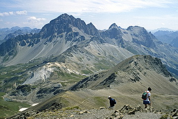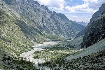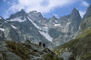 Ein leicht zu erreichender Aussichtspunkt mit schöner Rundsicht nicht nur auf die nahen Gipfel der Dauphine liegt westlich des Galibier Passes. Vom Parkplatz unterhalb der Passhöhe führt ein breiter Weg in etwas mehr als einer Stunde auf den Pic Blanc de Galibier (2955 m). Den Talschluss bei Ailefroide bildet die Ebene 'Pre de Madame Carle' mit dem Refuge Cezanne (1874 m) - dem Ausgangspunkt für die Besteigung der Barre des Ecrins. Wir begnügten uns mit einer leichten Wanderung zum Glacier Noir. Immer auf der Gletschermoräne führt der Weg bis zum Ende des Tals, von wo aus man einen guten Einblick in die Nordabstürze des Mont Pelvoux hat.