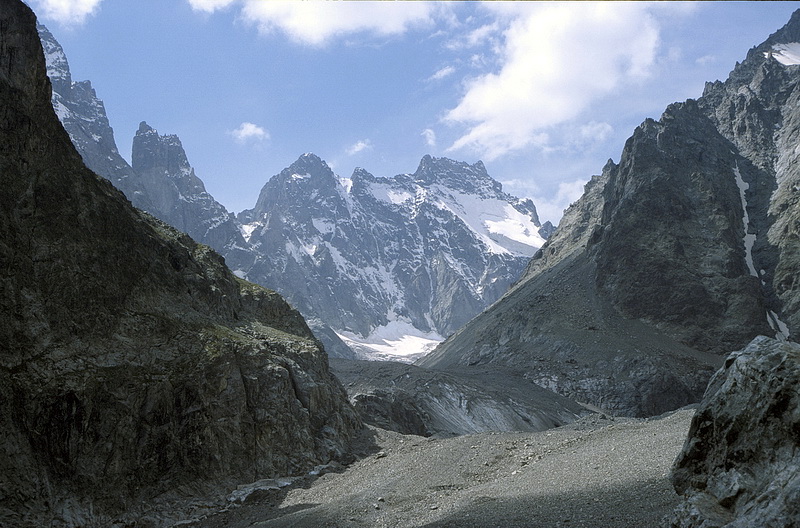 At the end of the valley Mont Pelvoux (3943 m), Aiguille de Pelvoux (3684 m) and Pic Sans Nom (3913 m - right) become visible.