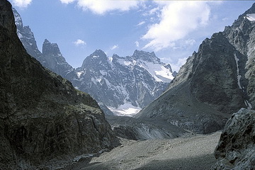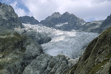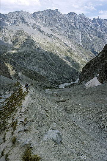 Pic Blanc de Galibier (2955 m) is a niceand easy to climb panorama summit west of the Galibier Pass. Starting at a parking area just below the pass the summit can be reached in less than two hours. The Cezanne Hut at 'Pre de Madame Carle'- a plain at the end of the valley near Ailefroide - is well known as the starting point for the ascent of Barre des Ecrins. We however were satisifed by doing an easy hike to the Glacier Noir. We followed the glacier moraine up to the end of the valley from where we had an impressive view towards the north face of Mont Pelvoux.