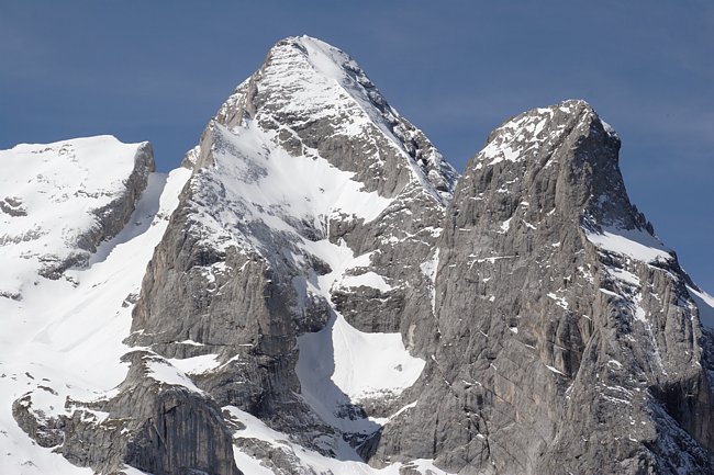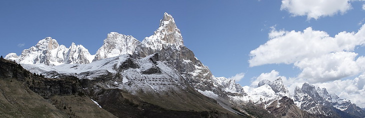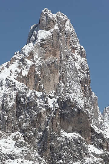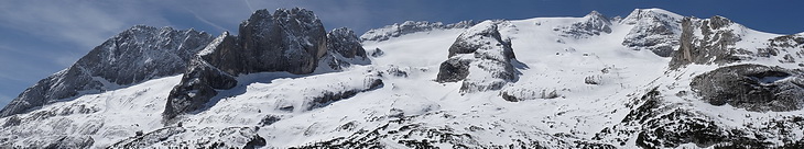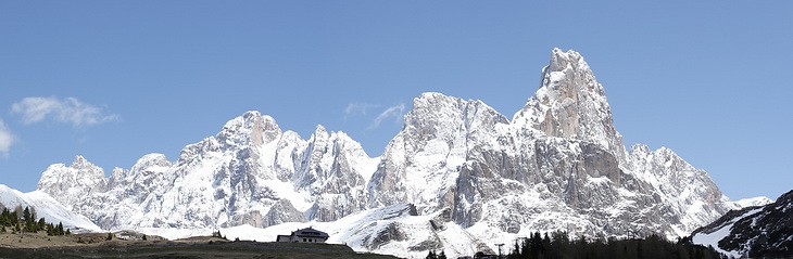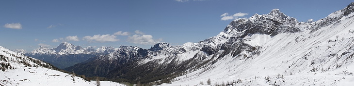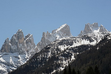Rolle Pass (1980 m): The snow covered Pale di San Martino Range and its highest summits Cima di Focobon (3054 m), Cima dei Burelon (3130 m), Cima della Vezzana (3192 m) and Cimon della Pala (3184 m).