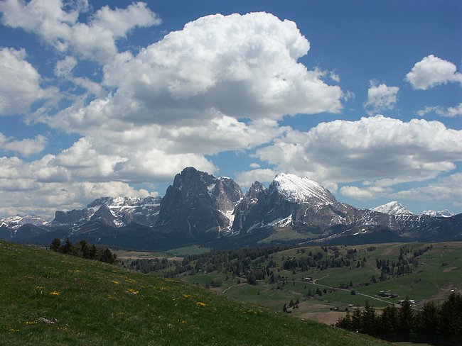 The nature reserve of Seiser Alm is the largest high-alpine pasture in Europe and also one the most remarkable places in the Dolomites. It is of great importance not only for farming but also for tourism, especially in winter. About 52 square kilometers in size it is situated between the valley of Gröden, Schlern and the Langkofel Group and offers quite a lot of hiking trails as well as different climbing routes. Quite a few rare flowers can be found at Seiser Alm which is in full flower between the middle of June and July. On top of Puflatsch at the eastern end of the Alm one has an excellent panorama up to the peaks of the Ortler and Adamello ranges.