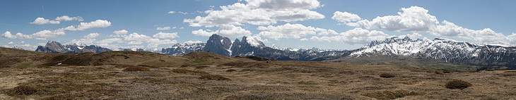 Die ersten Versuche mit Panoramastativ. Langkofel und Plattkofel sind neben dem Schlern die Wahrzeichen der Seiser Alm.