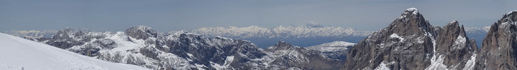 Nach Süden dominiert die Marmolada, an die sich rechts die Pala anschliesst. Etwa in Bildmitte erkennt man Latemar und Rosengarten, dahinter wie gehabt Adamello, Presanella...