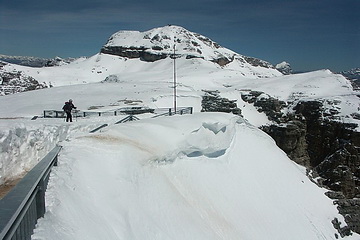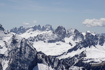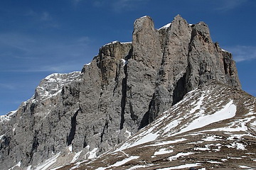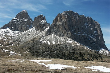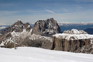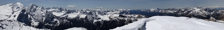 The ultimate panorama summit is definitely Piz Boe (3152 m). Unfortunately there was still too much snow. We were content with staying at Sass Pordoi where we also found an excellent panorama as sor example to Langkofel and the Oetztal Alps. The rounded summit in the foreground is Piz Ciavazes with the Sella Towers below.