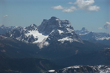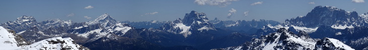 Auch nach Osten eine eindrucksvolle Kulisse mit Sorapis, Antelao und Monte Pelmo. Ganz im Hintergrund die Nadel des Duranno in den Friauler Dolomiten, daneben rechts der wuchtige Felsklotz der Civetta.
