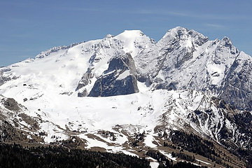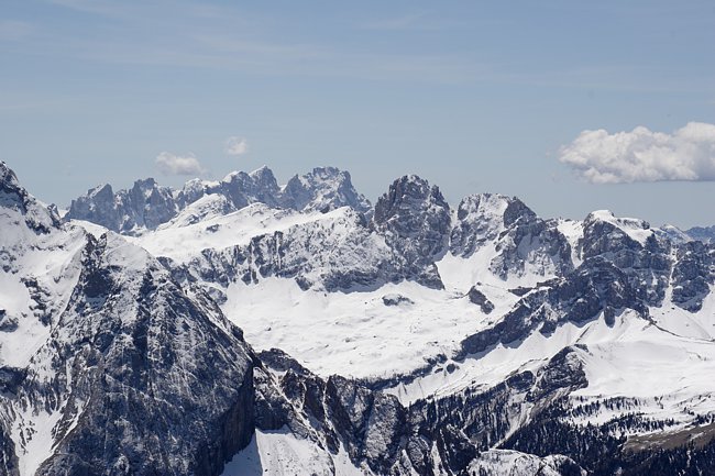 In southern direction Marmolada is dominating which is followed by the Pala Group. In the center of the picture Latemar and Rosengarten can be figured out. In the background as already mentioned Adamello, Presanella....