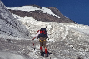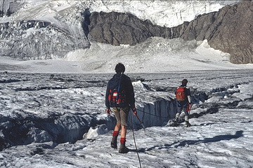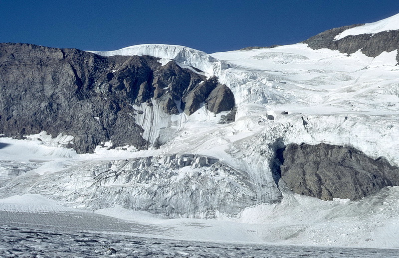 Auf dem Weg durch Gletscherbruch waren damals (1983) einige Spalten zu überqueren um auf den oberen Teil des Evettes Gletschers zu gelangen.