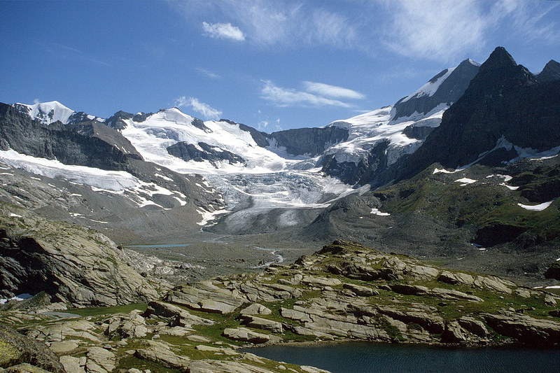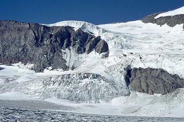 Gletschertisch vor der Petite Ciamarella (3520 m) - ganz links die Grande Ciamarella (3676 m). Von hier aus führt der weitere Weg diagonal von links über den Eisbuckel und den oberen Teil des Gletschers zum Albaron Sattel auf 3474 m.