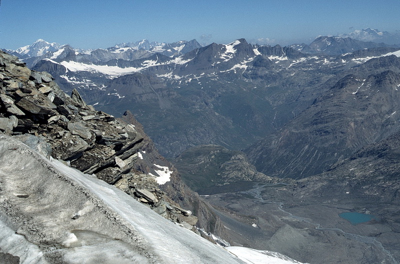 To the north Mont Blanc, Grandes Jorasses and Grand Combin. The Evettes Hut is situated on the rocks right in the centre.