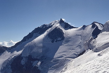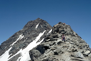 The final part from the saddle (3474 m) to the summit leads across a rocky ridge (grade I - II) which is most easily climbed directly on top of the ridge.